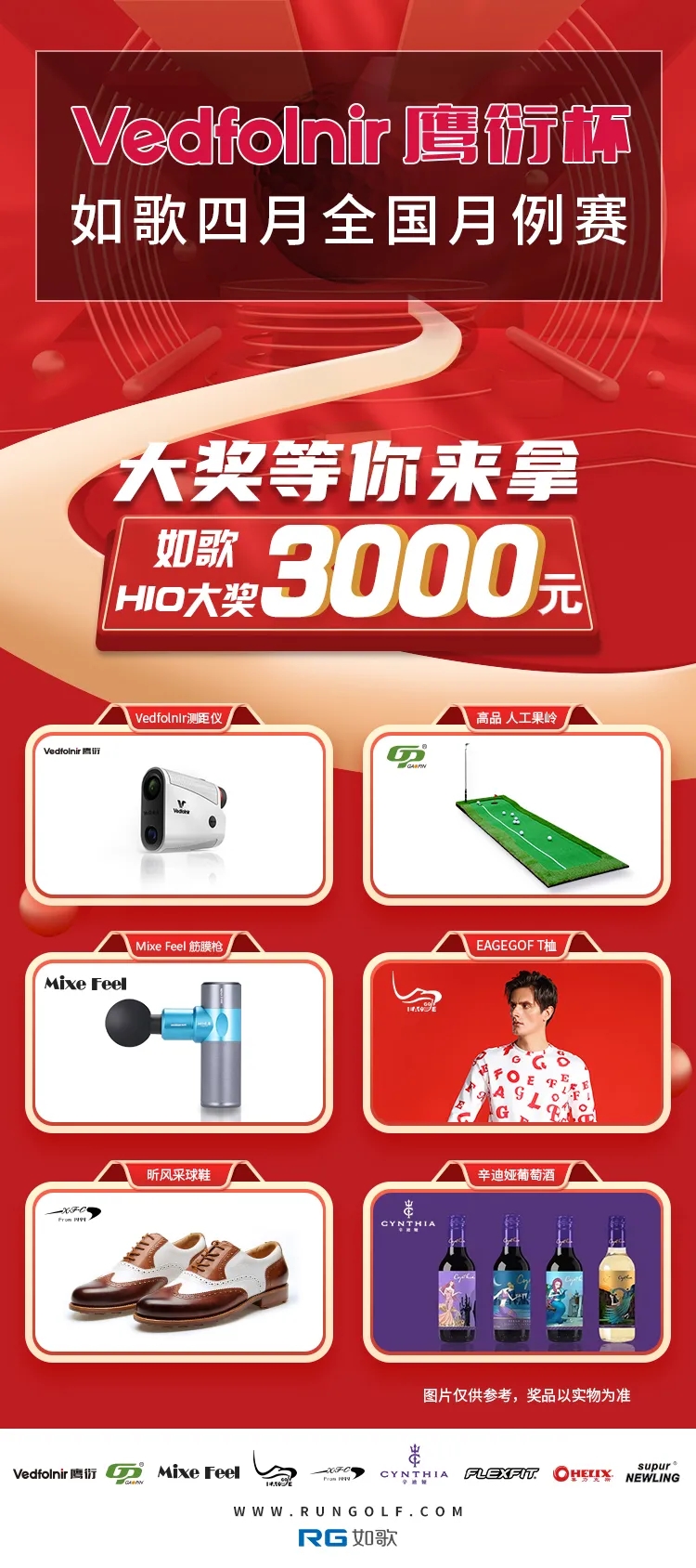 本次比賽設(shè)立了豐富的獎(jiǎng)項(xiàng)與豐厚的獎(jiǎng)品!獎(jiǎng)項(xiàng)包括:一桿進(jìn)洞3000元現(xiàn)金大獎(jiǎng)、總桿獎(jiǎng)、凈桿獎(jiǎng)、鼓勵(lì)獎(jiǎng)、跳跳獎(jiǎng)、球館獎(jiǎng)...... 獎(jiǎng)品涵蓋:Vedfolnir測(cè)距儀、高品人工果嶺、Mixe Feel筋膜槍、昕風(fēng)采高爾夫鞋、腰帶、辛迪婭葡萄酒、FLEXFIT定制球帽......
