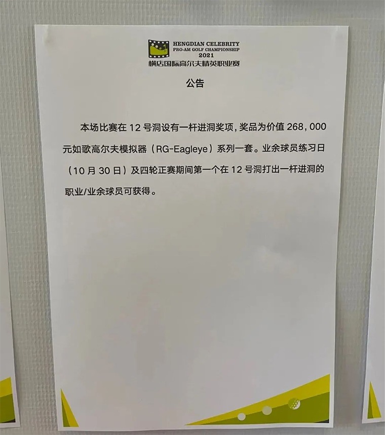 同時如歌為本次賽事特別贊助了一桿進洞大獎,獎品為價值268000元如歌高爾夫模擬器(RG-Eagleye)系列一套。練習(xí)日(10月30日)與四輪正賽期間(10月31日~11月3日)第一個在12號洞打出一桿進洞的職業(yè)/業(yè)余球員可獲得這個大獎。