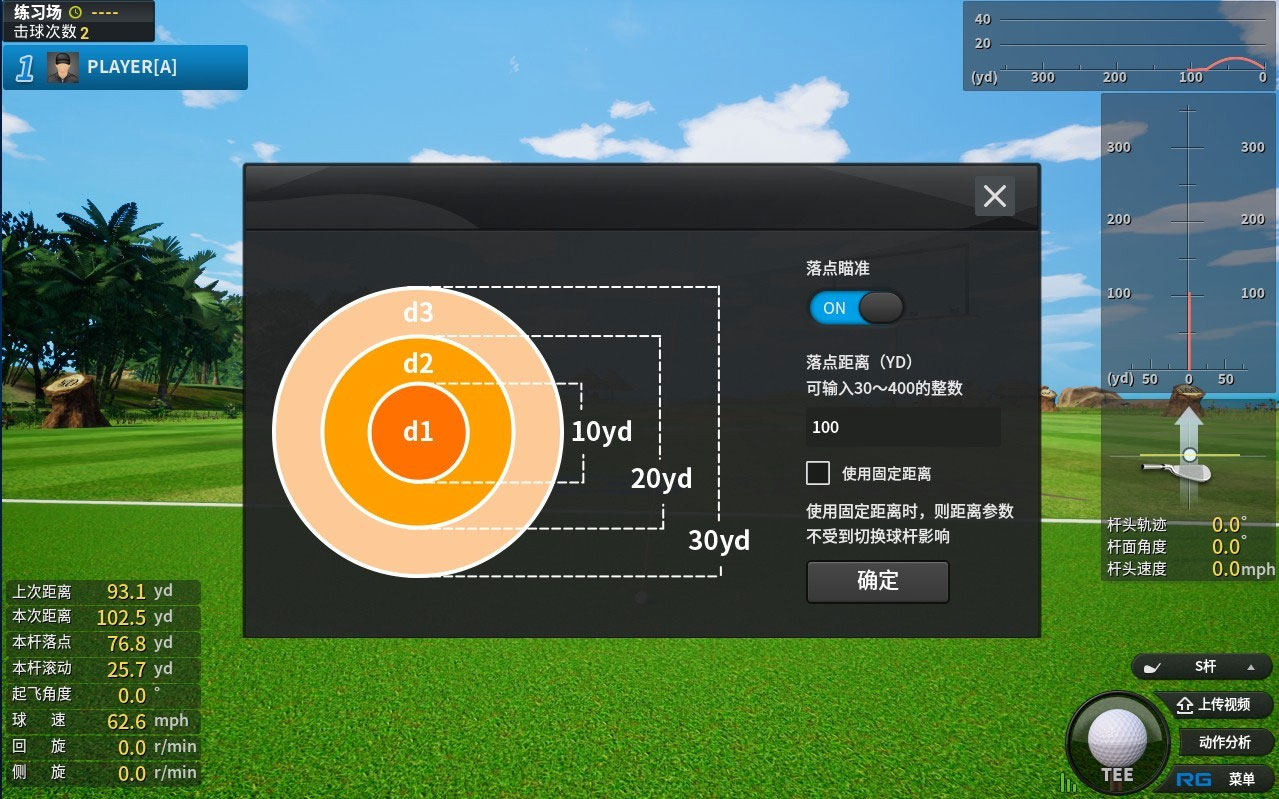 在練習(xí)場的長桿練習(xí)球場中,新增了“精準(zhǔn)度訓(xùn)練”。練習(xí)場地面上會出現(xiàn)一個直徑30碼的落點瞄準(zhǔn)器,落點距離會根據(jù)球桿的選擇而變化,具體的數(shù)據(jù)以“智能球童”的設(shè)置為依據(jù),也可以輸入距離進行練習(xí)。